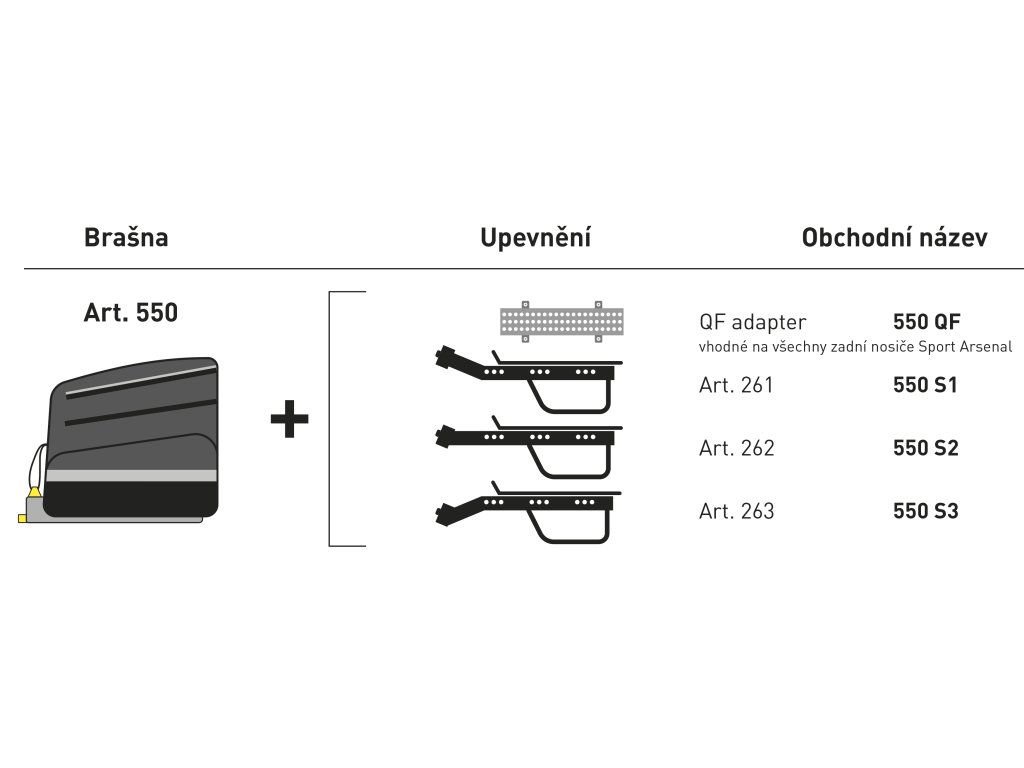 Akční set brašny art.550 a QuickFix adapteru pro všechny zadní nosiče Sport Arsenal, nebo přední nosič art.203. Originálním QuickFix systémem přináší rychlé a spolehlivé uchycení brašny k nosiči.