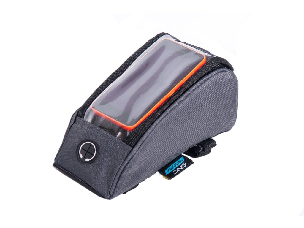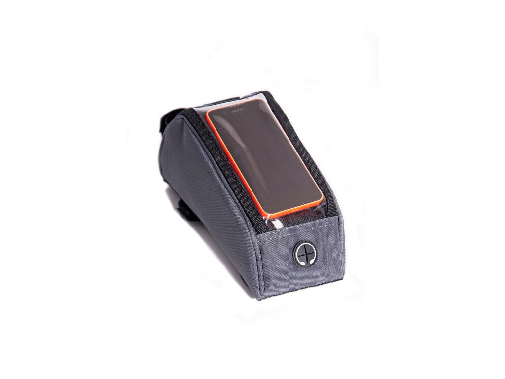Brašna na přední část rámu pro smartphone, powerbanku apod. Praktická objemná brašna na veškeré nezbytnosti, které je třeba mít stále na očích (mobilní telefon, kompaktní fotoaparát, peněženka, klíče, nářadí).