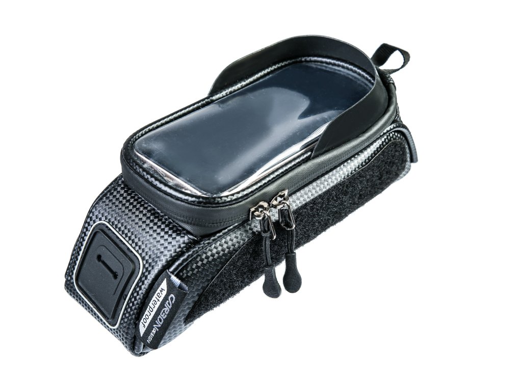 Brašna na horní rámovou trubku s kapsou pro mobil z moderního materiálu CarbonDesign. Praktická objemná brašna na veškeré nezbytnosti, které je třeba mít stále na očích (mobilní telefon, kompaktní fotoaparát, peněženka, klíče, sušenka).